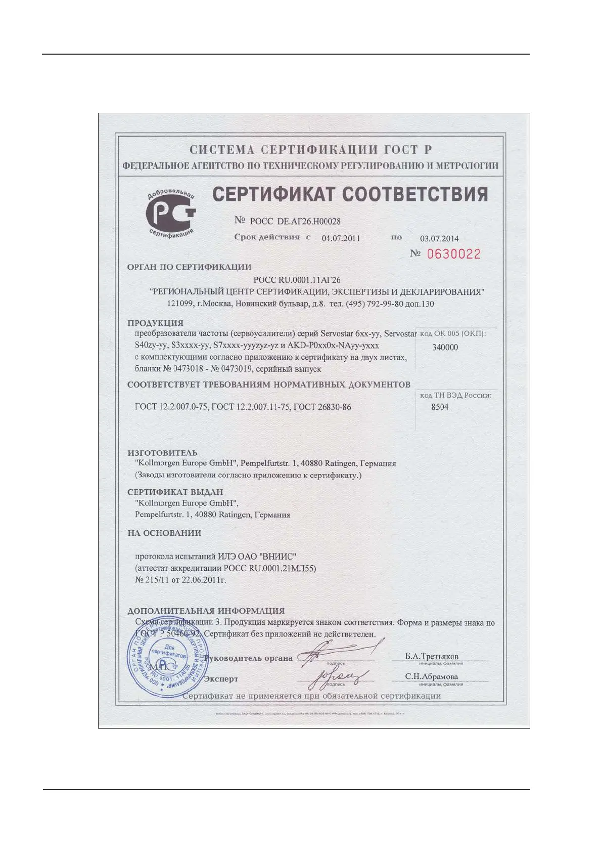 Certificate for servo amplifier and accessories (cover page, page 1 of 3).