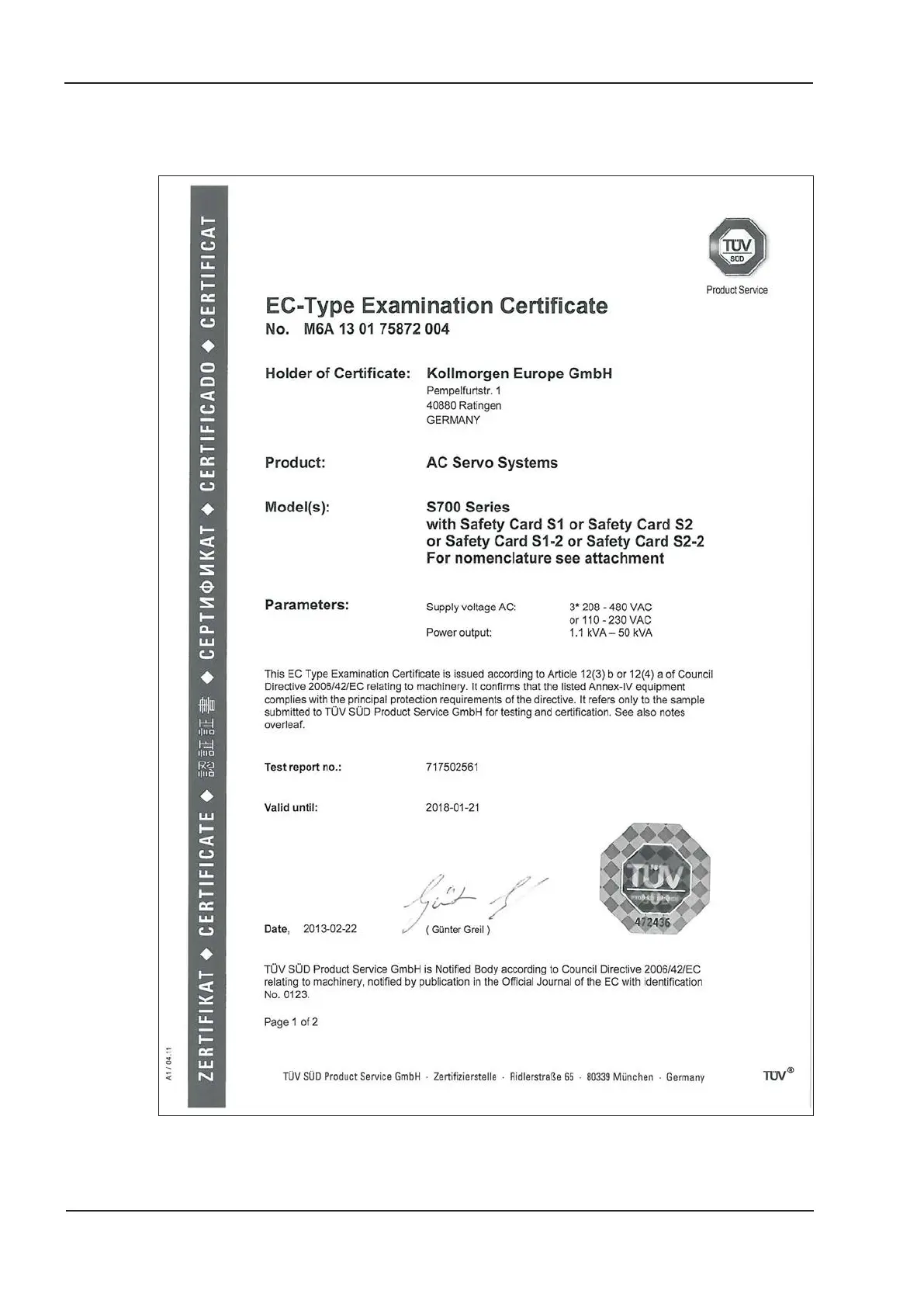 3.4.2 Safety Certificate S700 with Safety Card