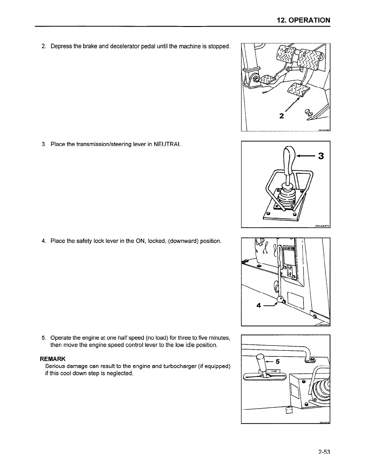 2. Depress the brake and decelerator pedal until the machine is stopped.