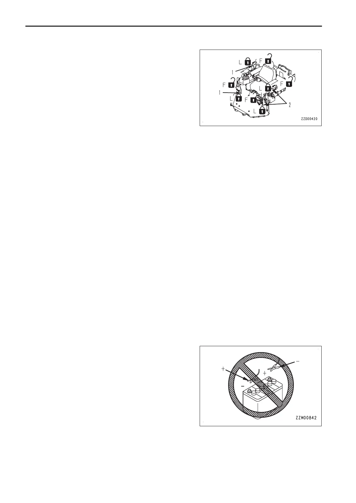 • Do not attempt to start the engine by short-circuiting the engine starting circuit. This may cause fire, serious