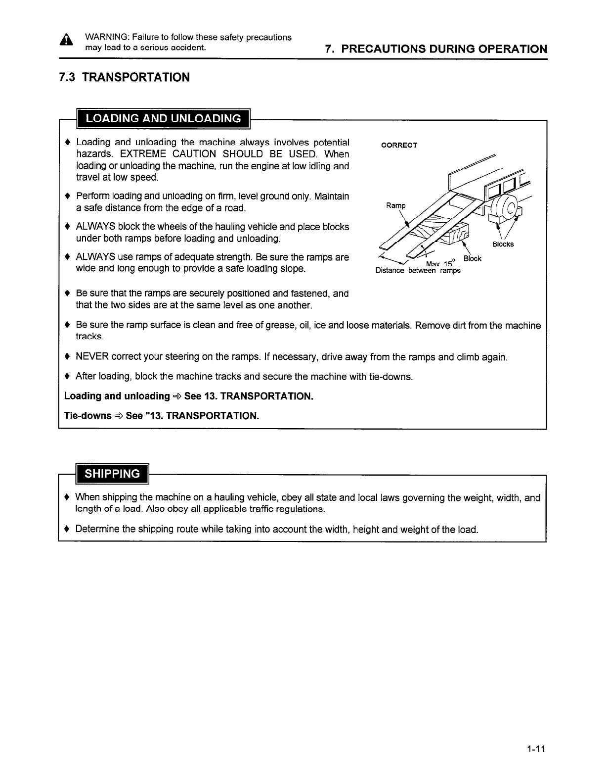 After loading, block the machine tracks and secure the machine with tie-downs.