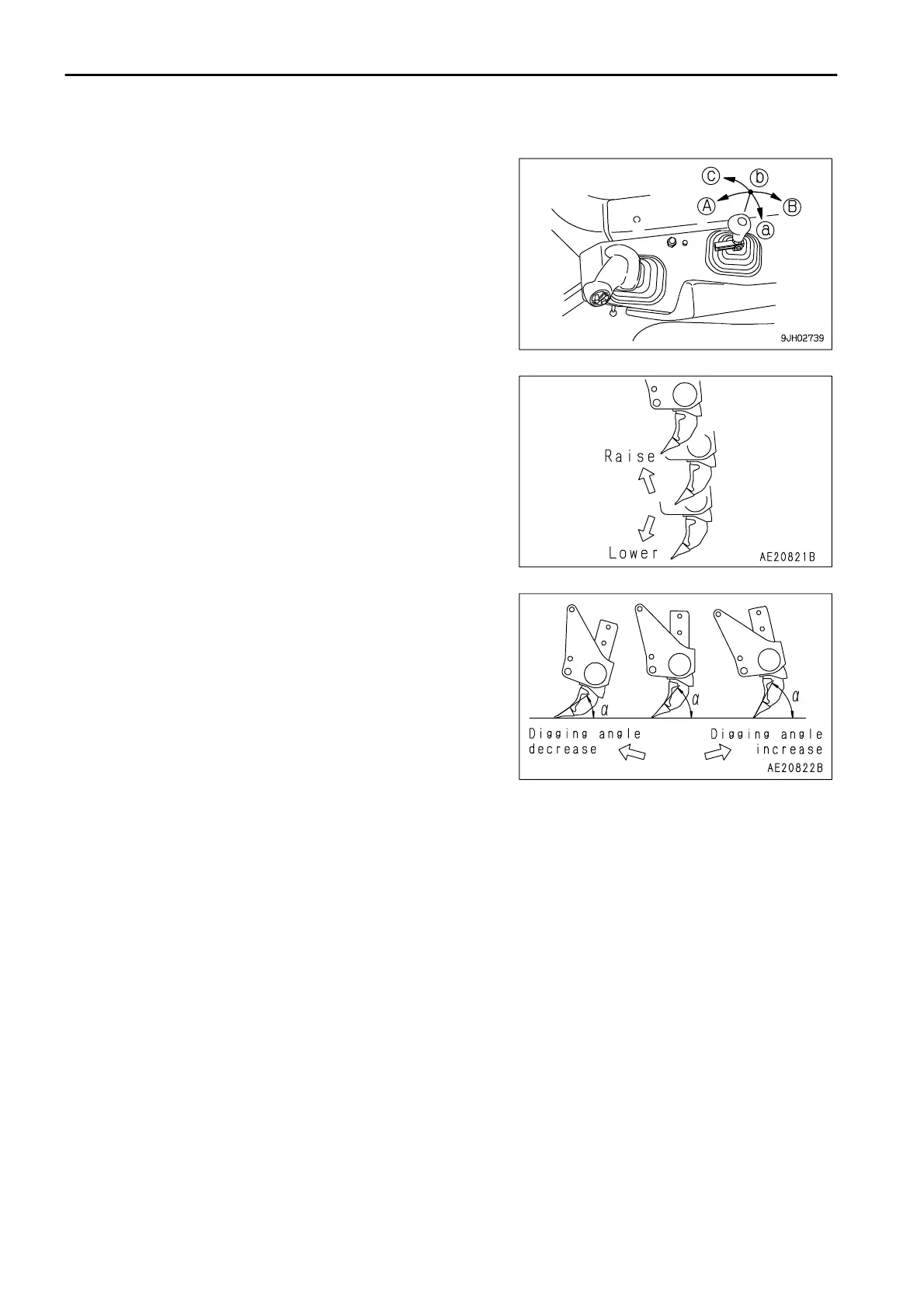 (B)Digging angle increased: Cutting angle (α) becomes larger.