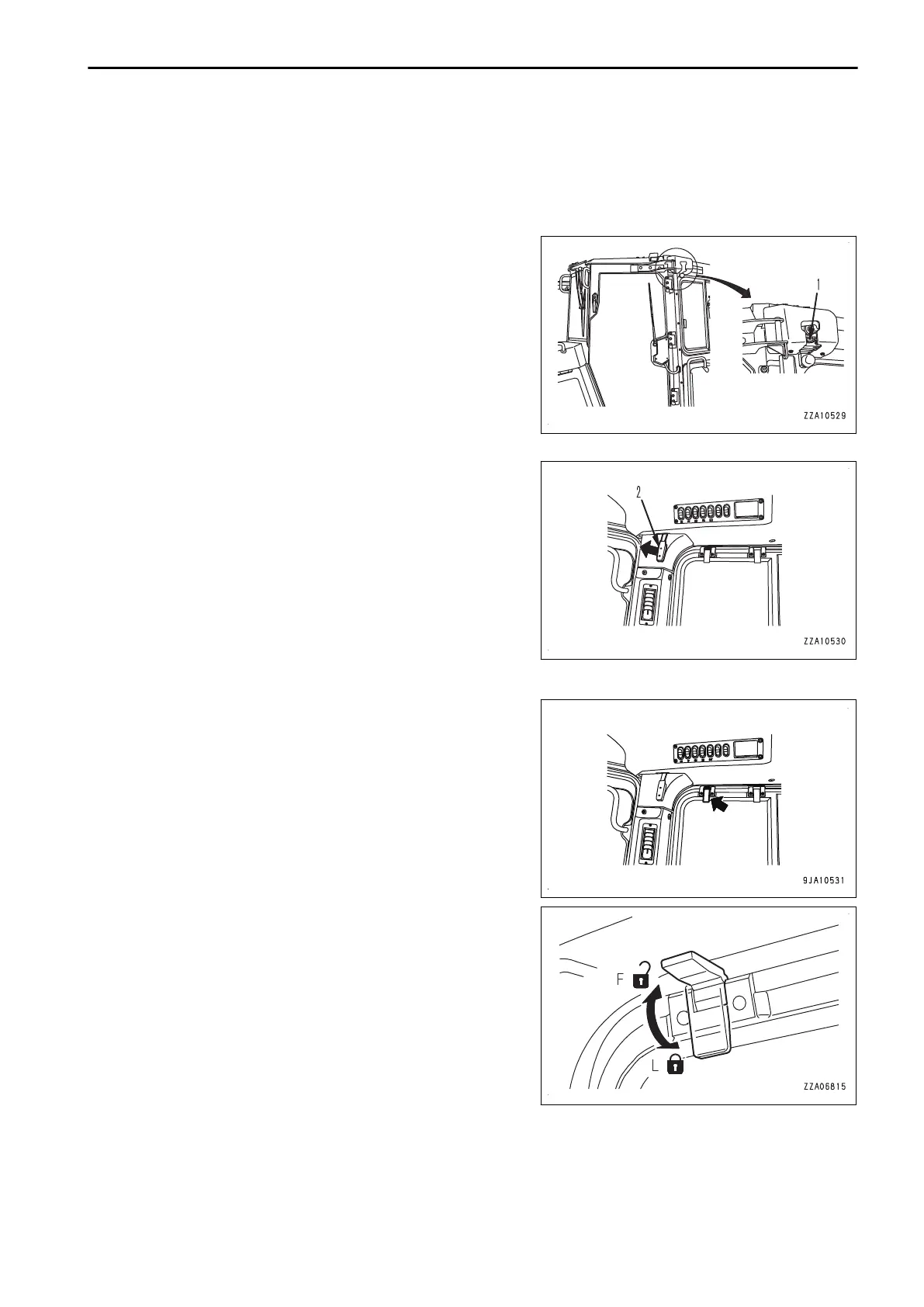 To release the door, move lever (2) inside the cab to the front of the cab.