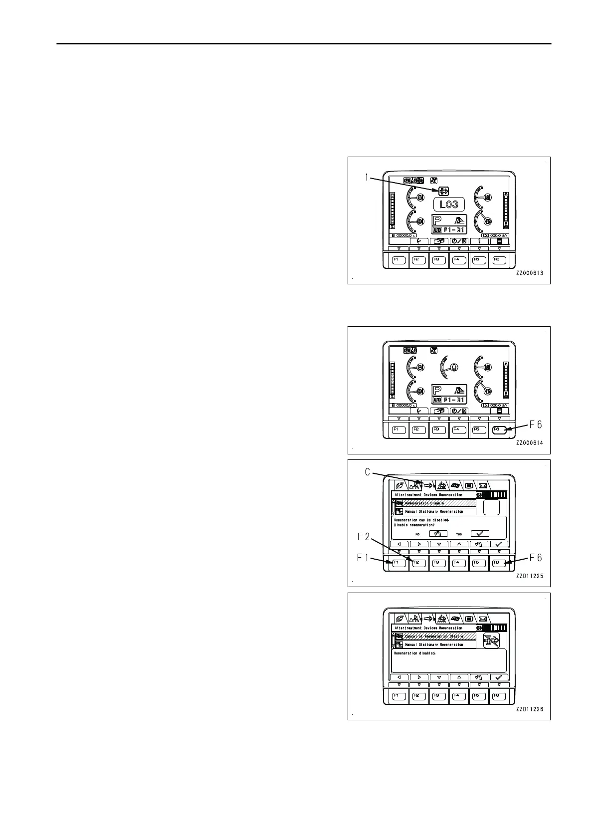 Operate switches F1 and F2 to select “Aftertreatment De-