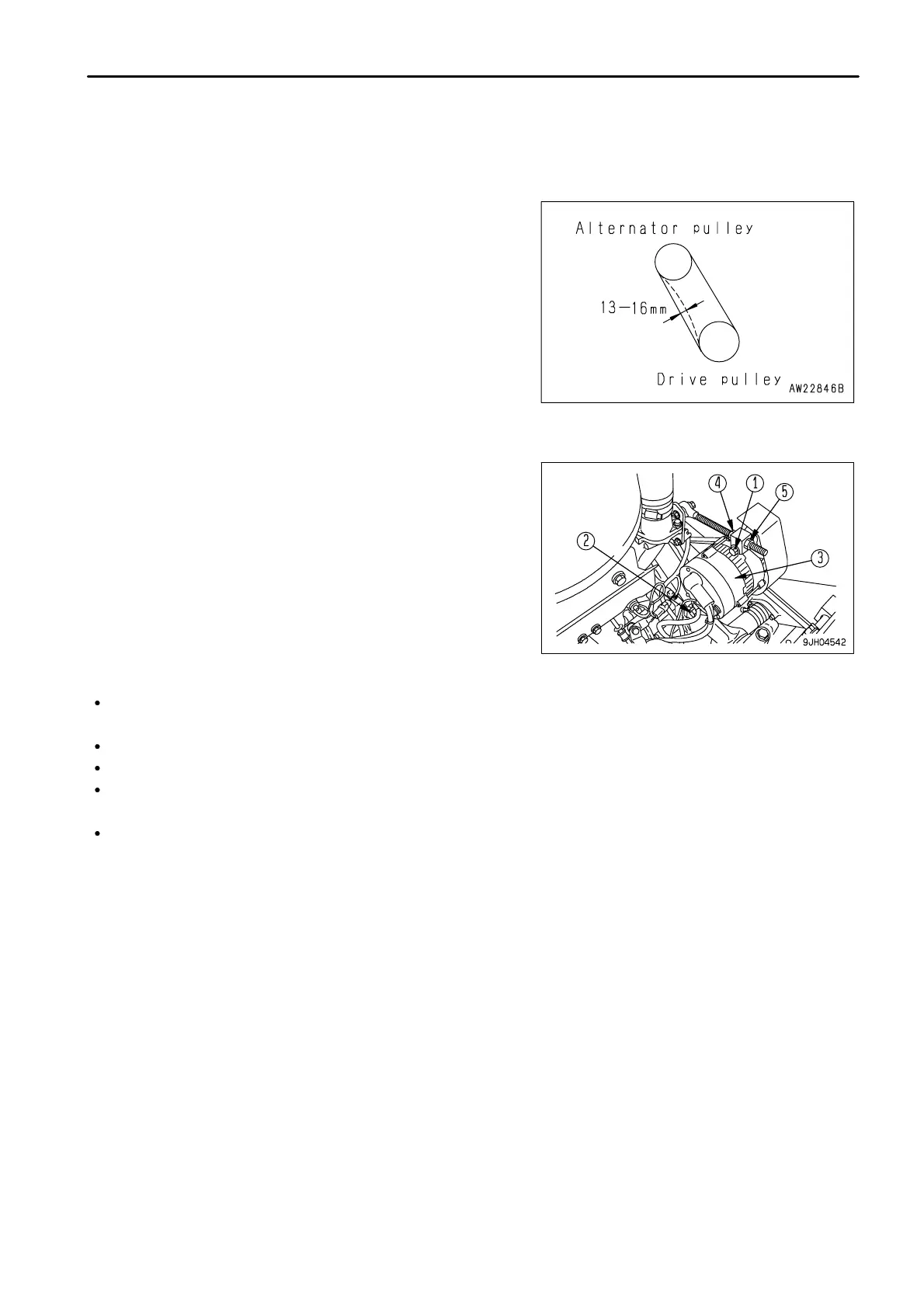 When adjusting the V-belt, do not press the alternator directly with a bar, but put a wood piece, etc. in-between