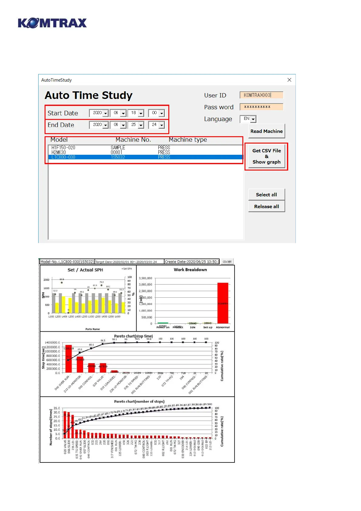 Enter the “Start Date”, “End Date” and select machine, click the “Get CSV File & Show Graph”.