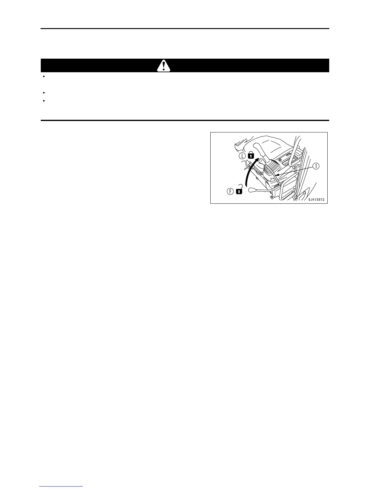 This lock lever is of hydraulic lock type. Accordingly, when it is in the lock position (L), the control levers or control