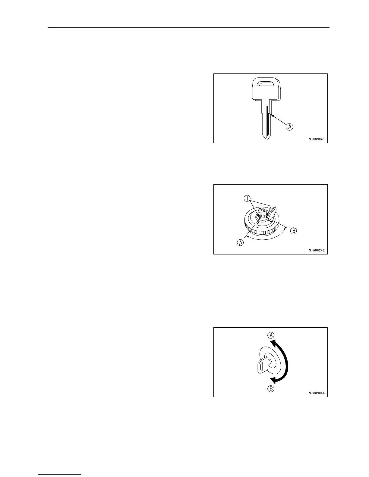 2. Turn the starting switch key to LOCK position (B), then remove the key.