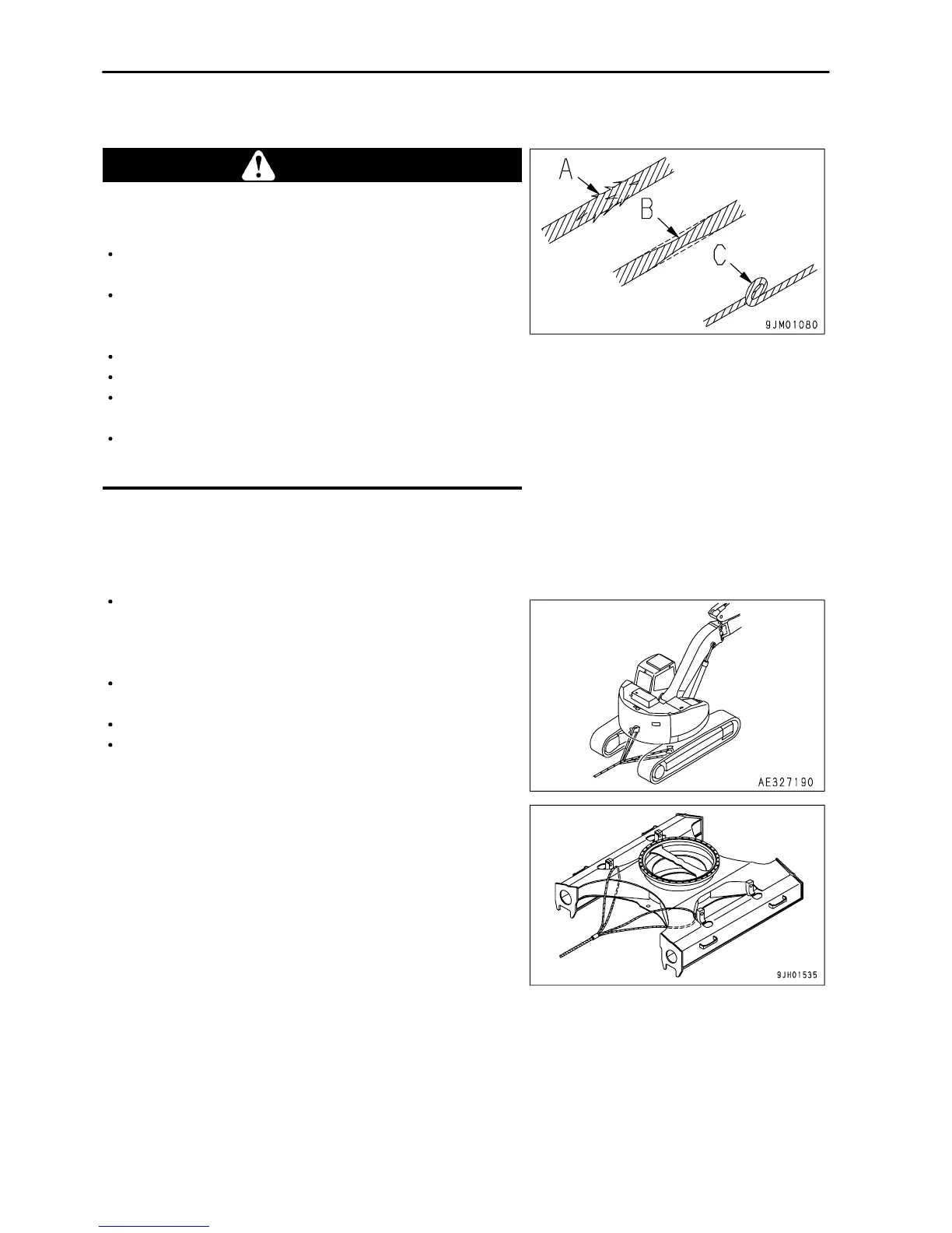 Never use a wire rope which has cut strands (A), reduced diameter (B),