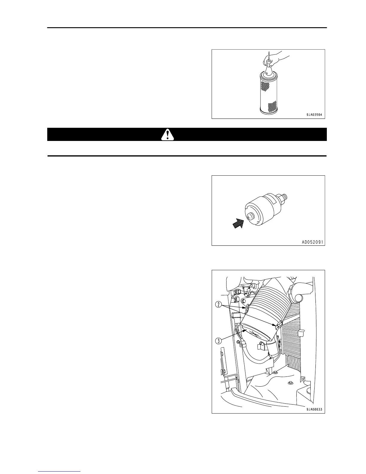 6. Set the cleaned outer element in position, then secure cover (3) with mounting clips (2).