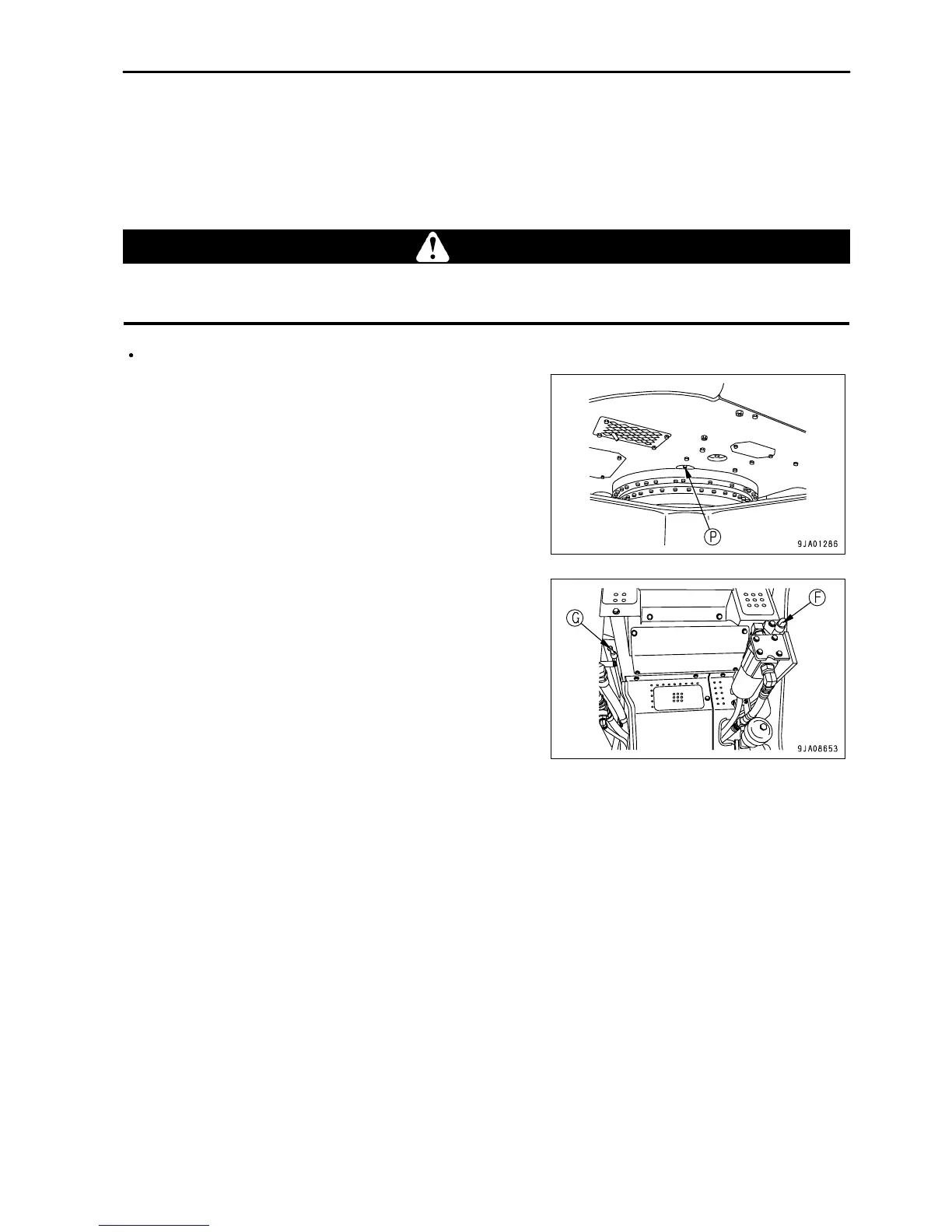 1. Swing the upper structure so that drain plug (P) is between the