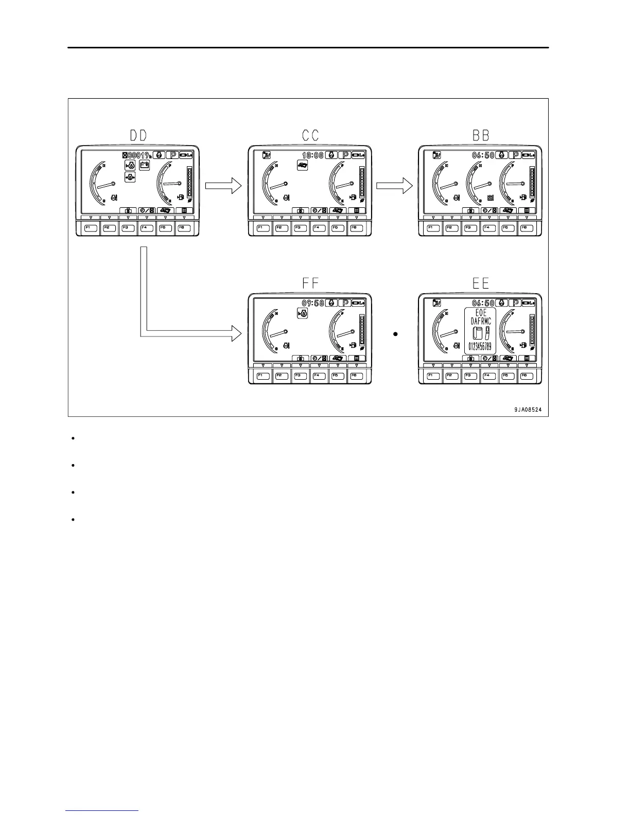 If there is any abnormality when starting the engine, the check before starting screen DD changes to the
