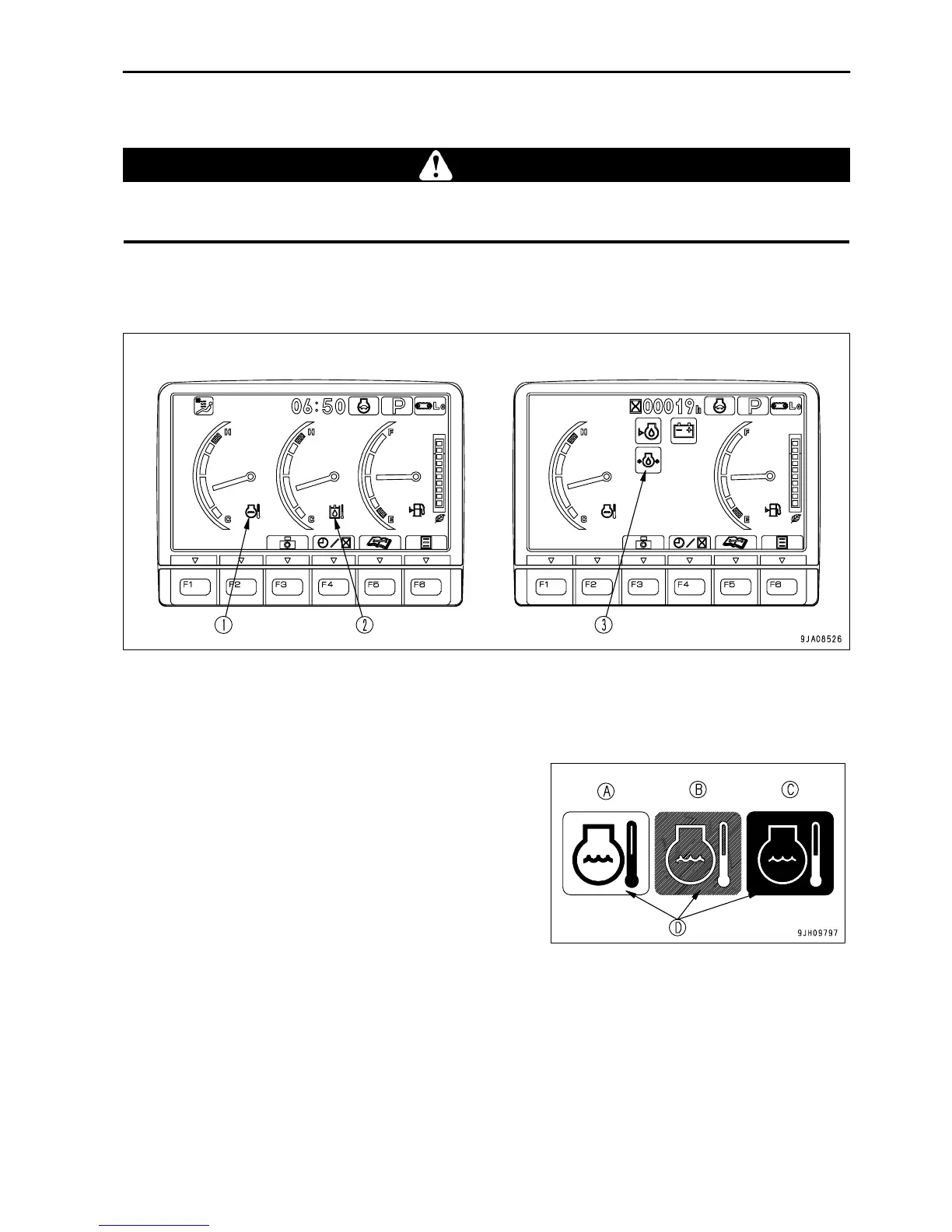 If the monitor lights up red, stop the engine immediately or run at low idle, check applicable location, then perform necessary