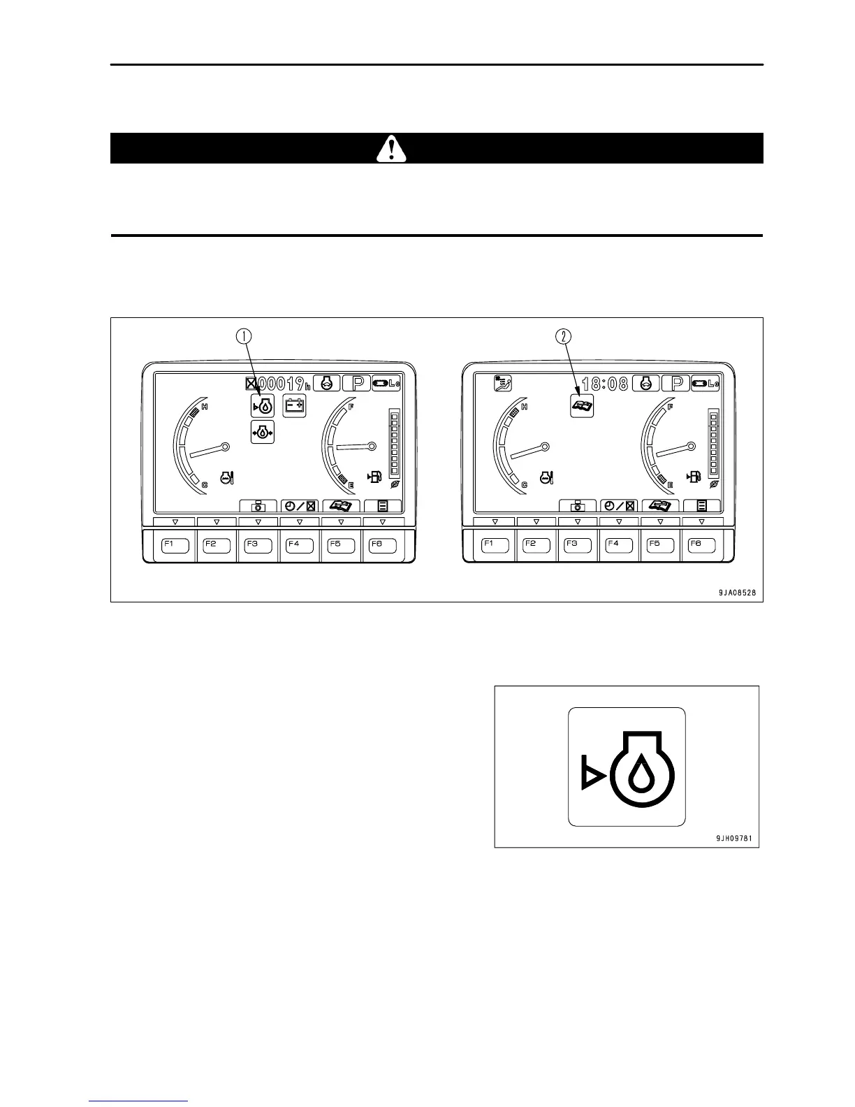 Monitor (1) warns the operator that the oil level in the engine oil pan