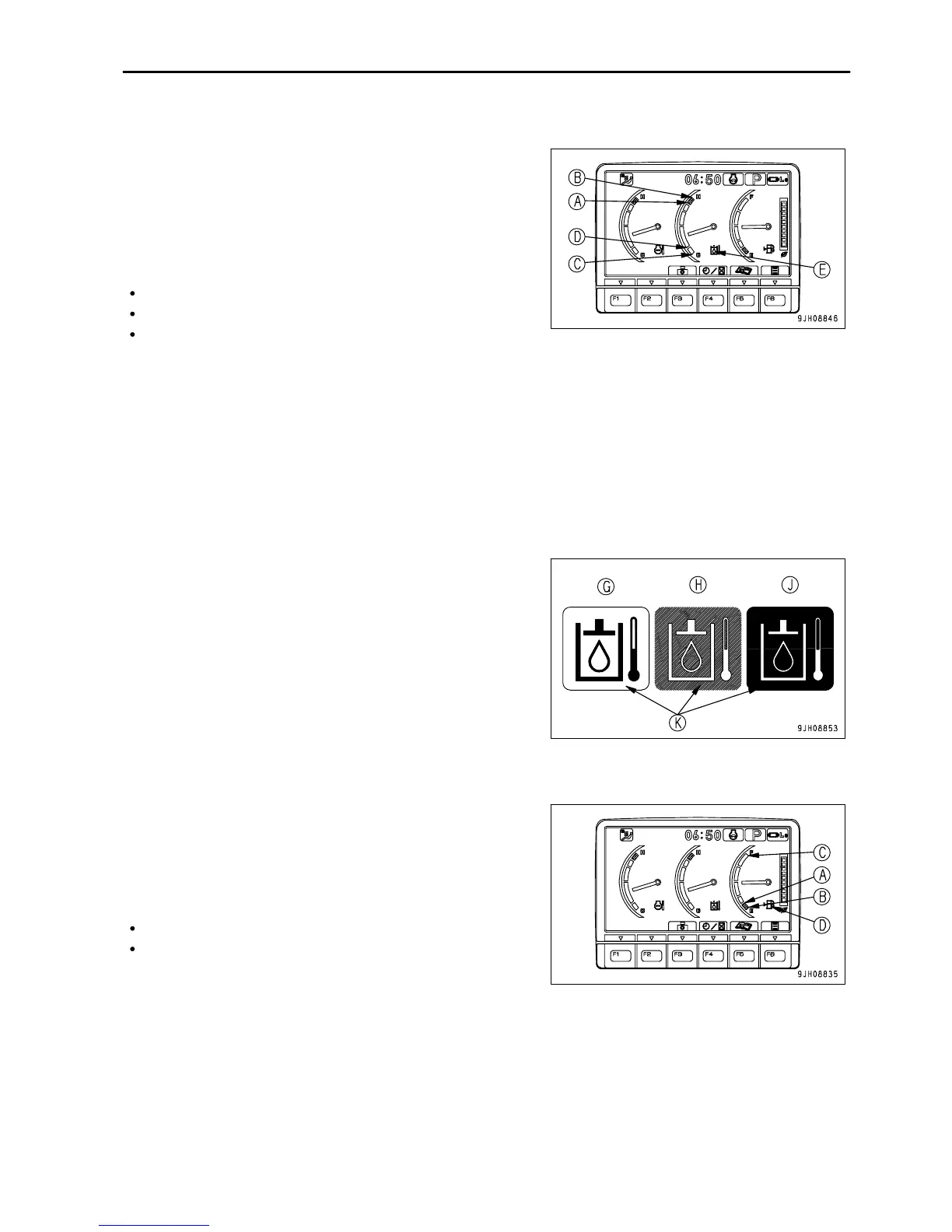 hydraulic oil temperature monitor (E) shows the low-temperature display. If this happens, carry out the warm-up