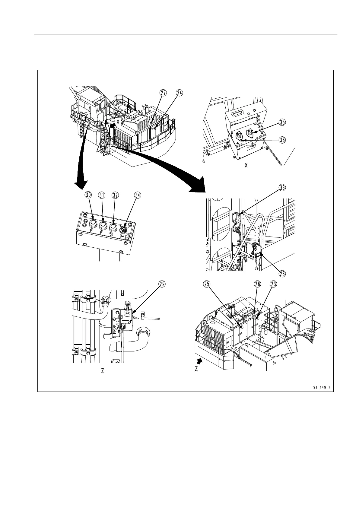 (27) Engine emergency stop switch (rear of power container) (34) Nighttime maintenance switch