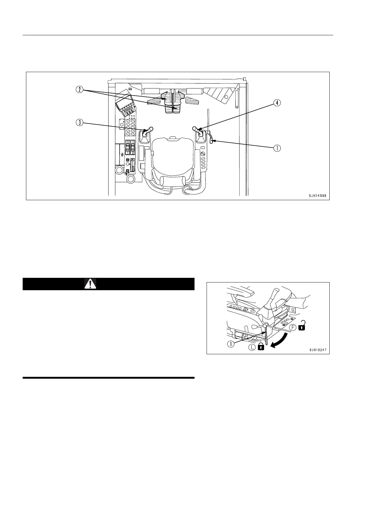 This lever (1) is a device to lock the work equipment, swing, travel, and attachment (if equipped) control levers.