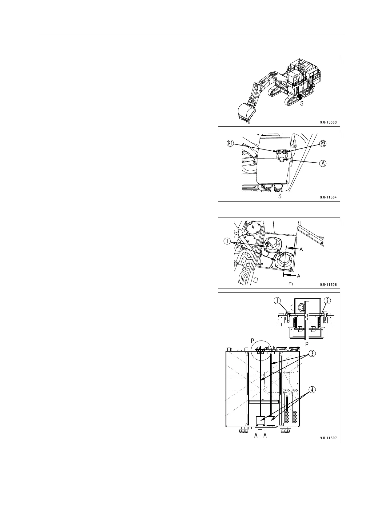 5. Loosen drain plugs (P1) and (P2) at the suction tube por-