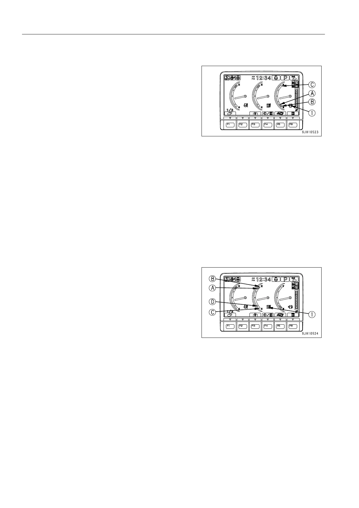 When the indicator is in red range (A) - (B), hydraulic oil temperature monitor (1) shows the abnormality display.