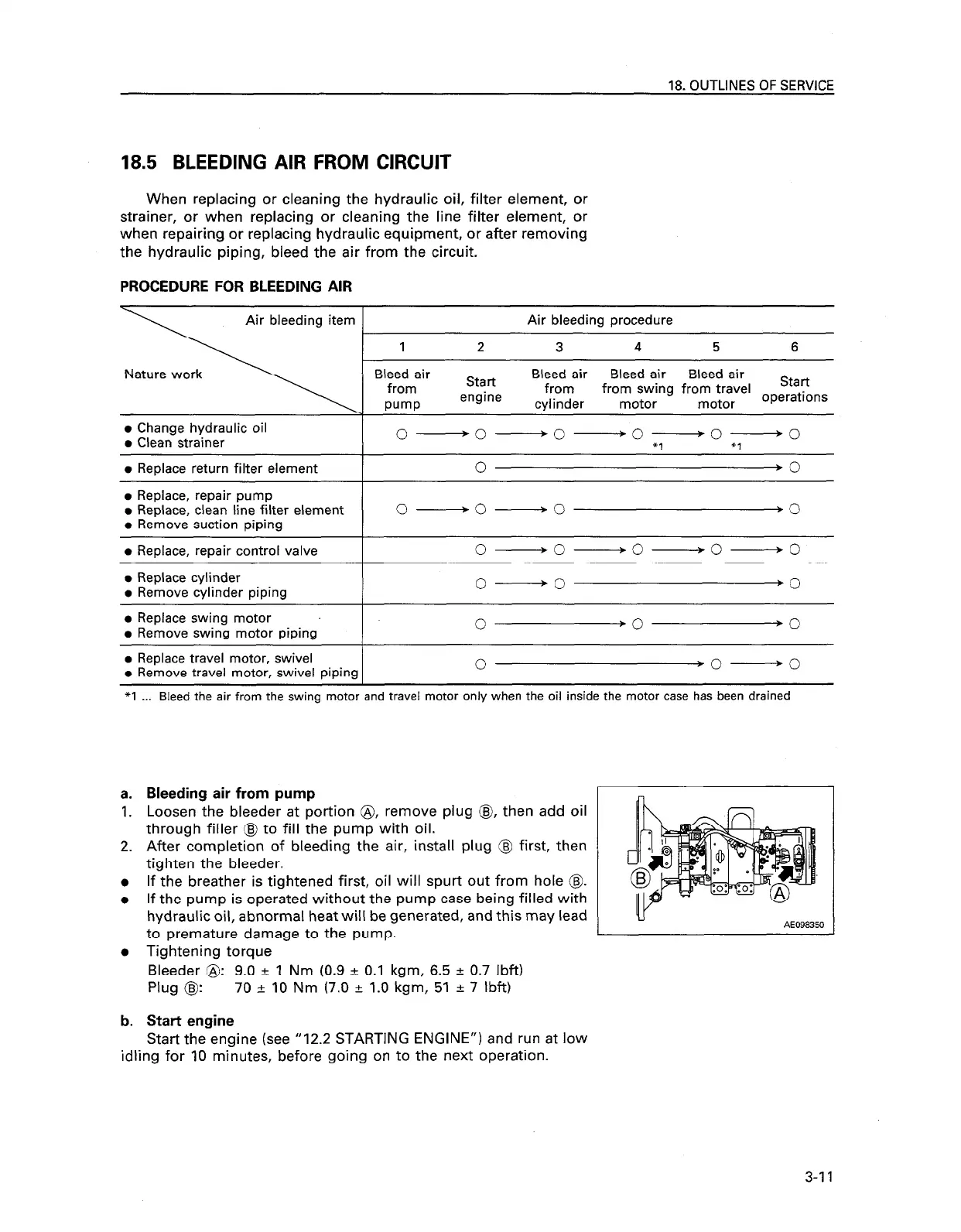 *1 . Bleed the air from the swing motor and travel motor only when the oil inside the motor case has been drained