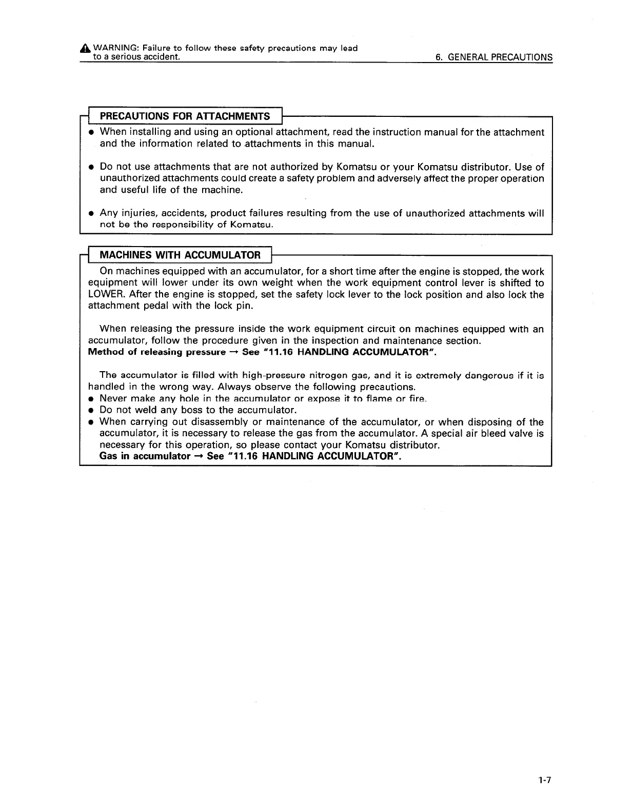 l Do not use attachments that are not authorized by Komatsu or your Komatsu distributor. Use of