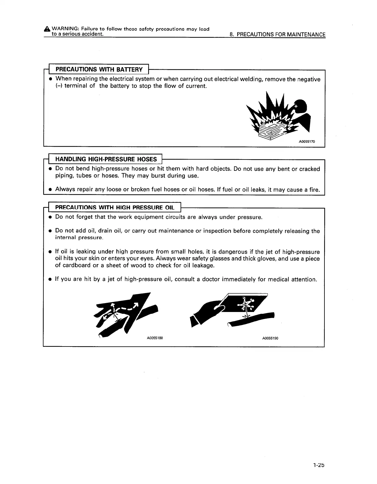 l Always repair any loose or broken fuel hoses or oil hoses. If fuel or oil leaks, it may cause a fire.