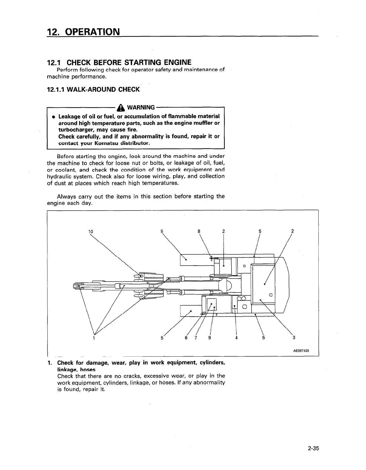 work equipment, cylinders, linkage, or hoses. If any abnormality