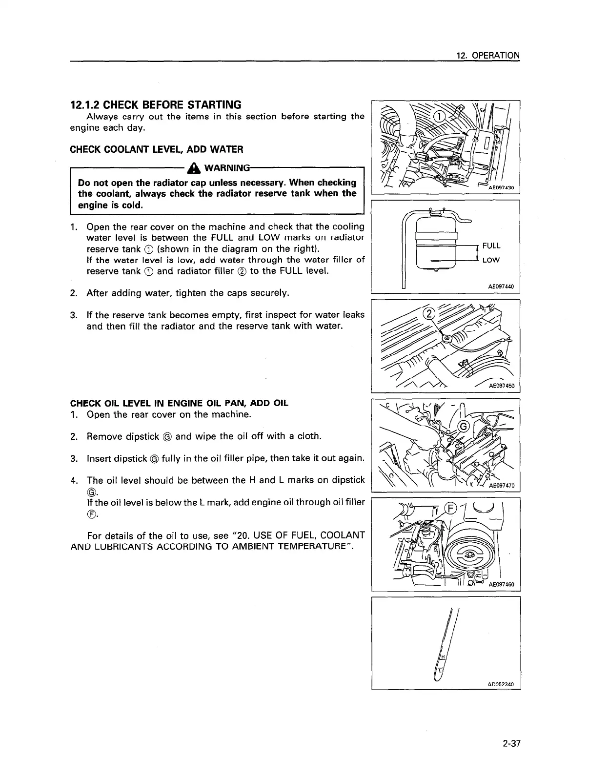 For details of the oil to use, see “20. USE OF FUEL, COOLANT