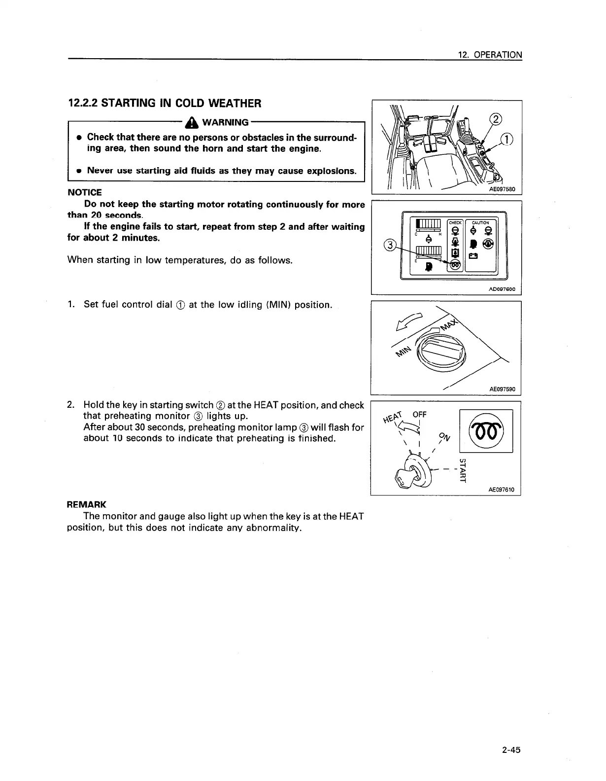 2. Hold the key in starting switch @ at the HEAT position, and check