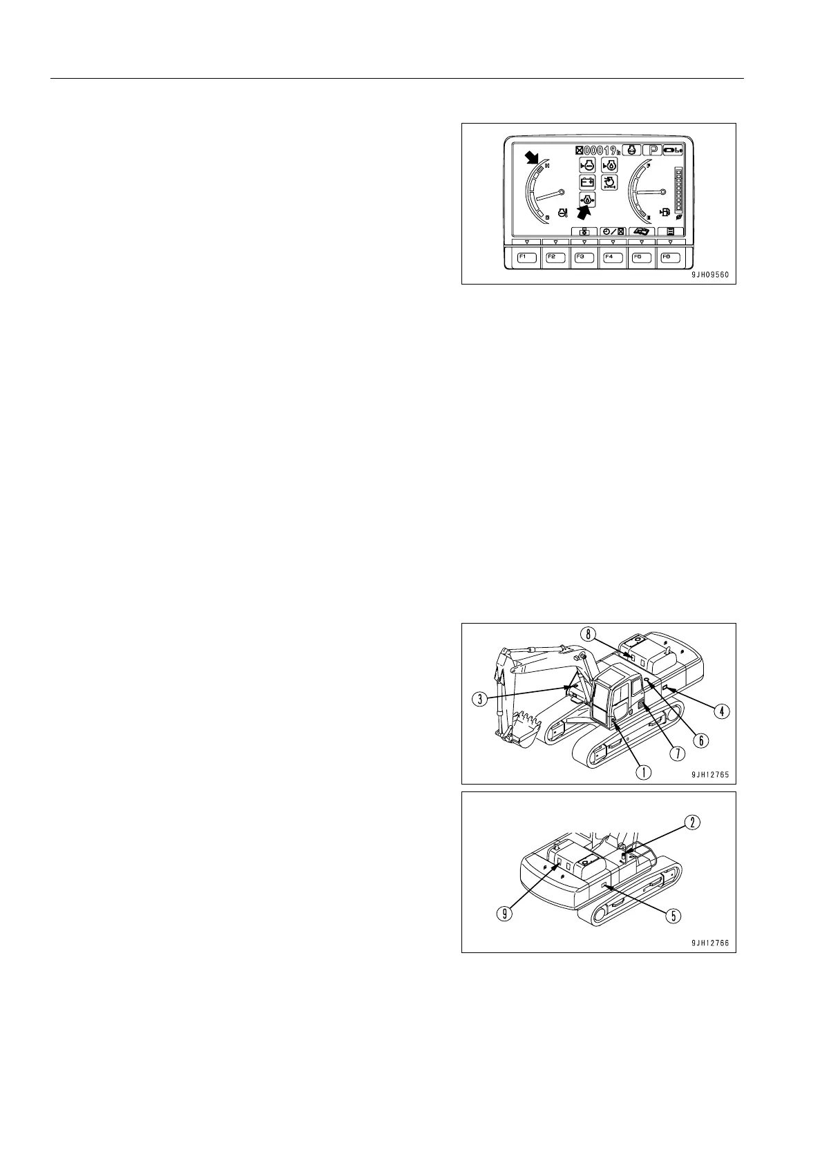 1. Walk around the machine and check the work equipment, machine exterior, and undercarriage, also check for
