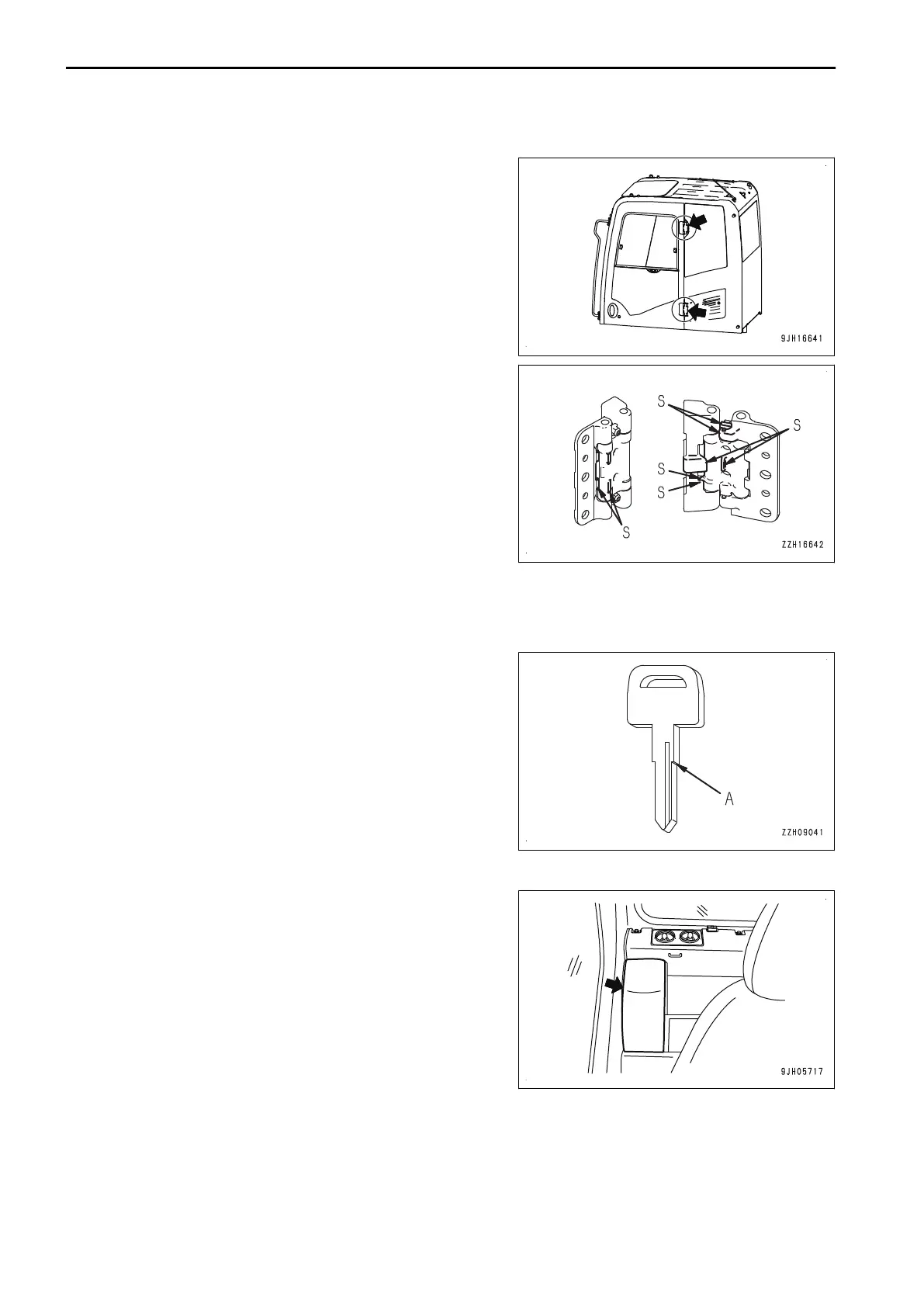 The cab door hinge has 2 rotation axes with stoppers (S).