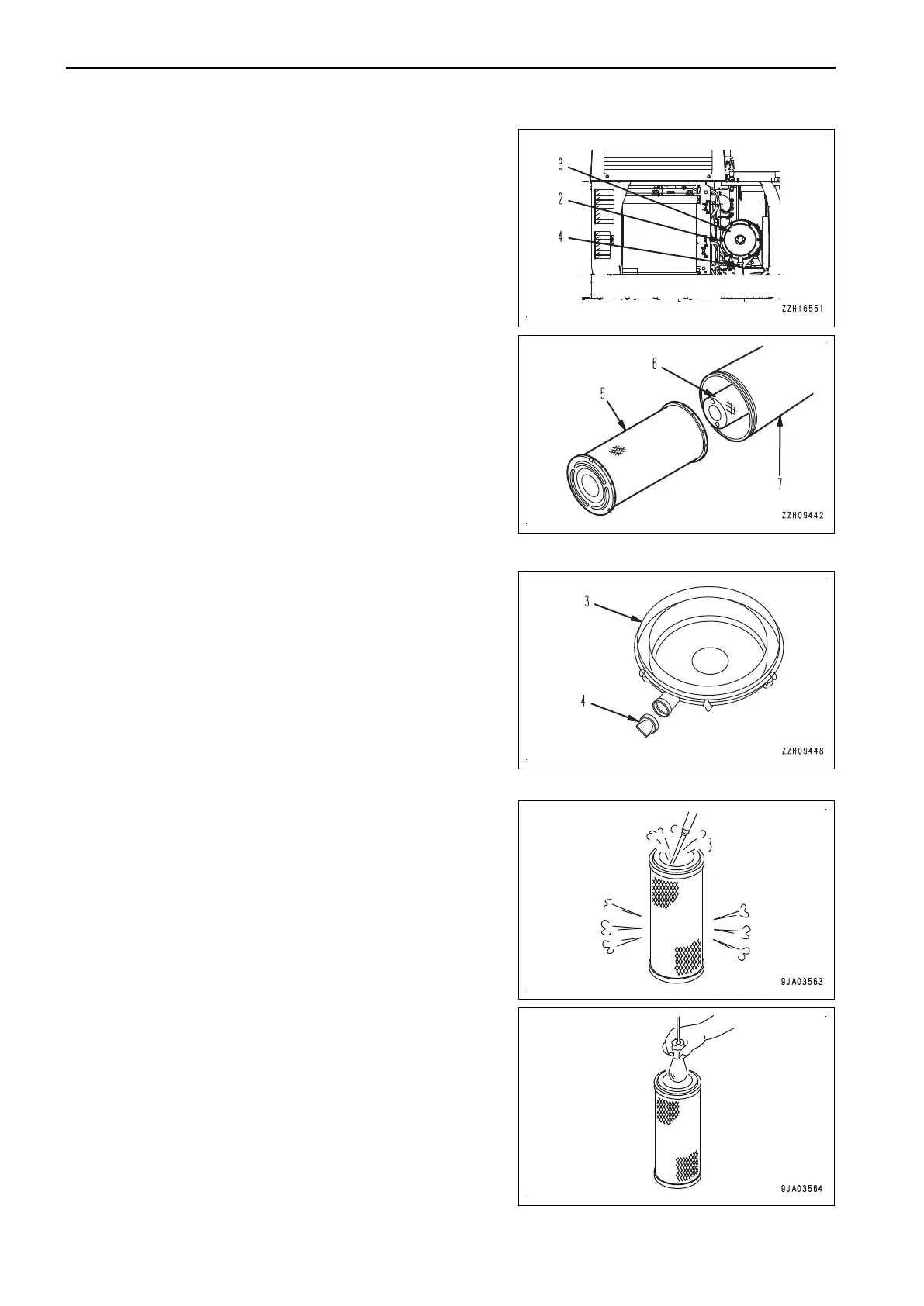 Clean dusts in inside and on cover (3) of air cleaner body (7) by using a clean cloth or brush.