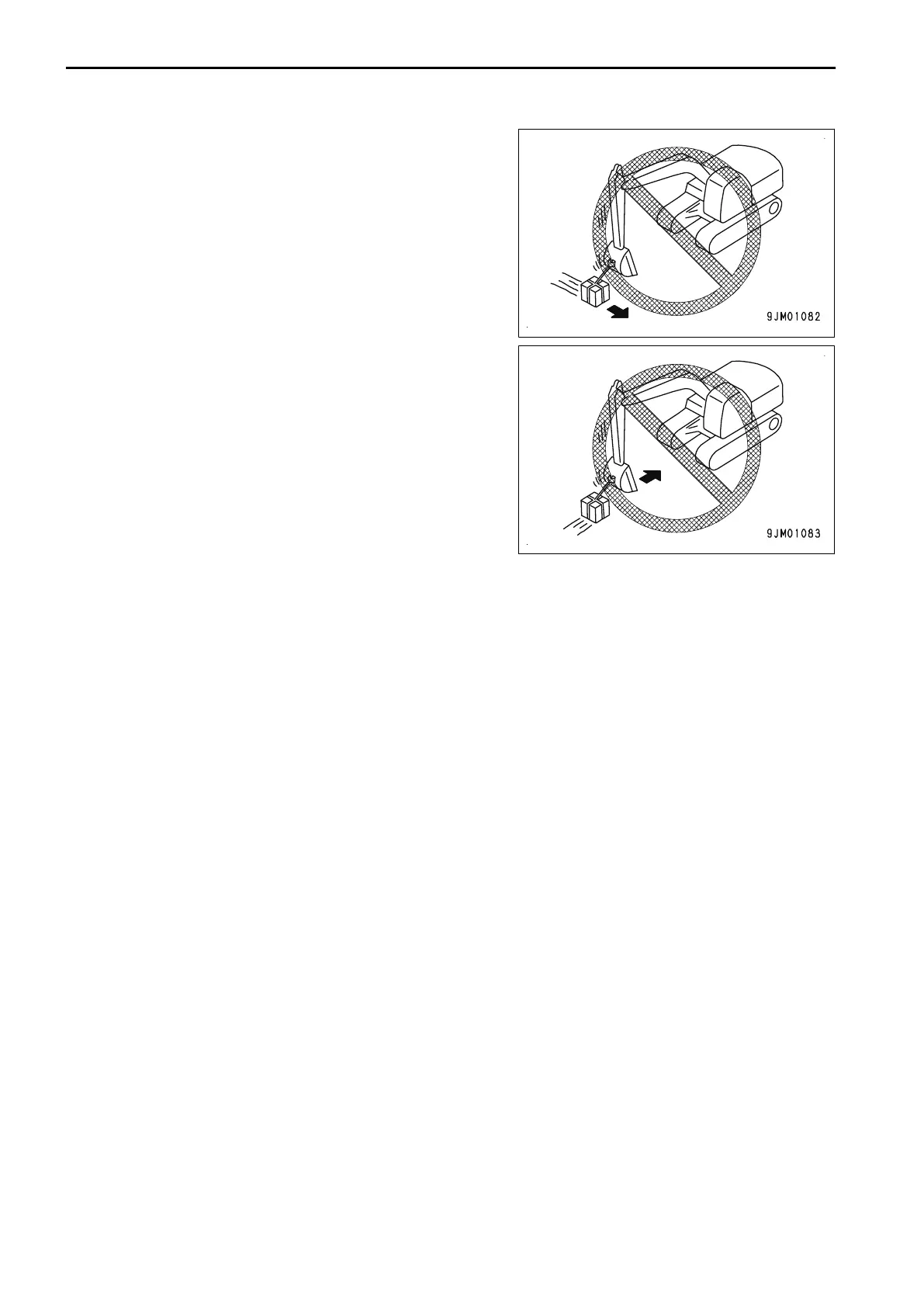 • Do not use the work equipment or swing to pull the load in