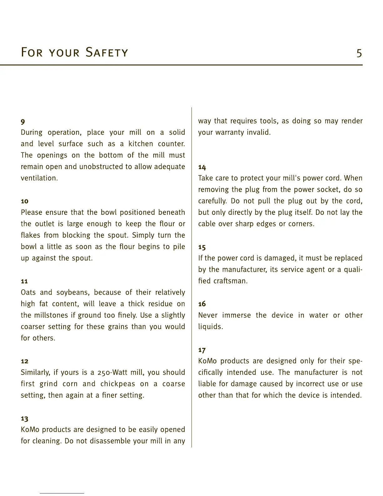 Komo Fidibus Medium - Further Safety Precautions; Safe Operation and Environment Requirements; Grain-Specific Grinding and Cleaning Advice; Power Cord Care and Safety