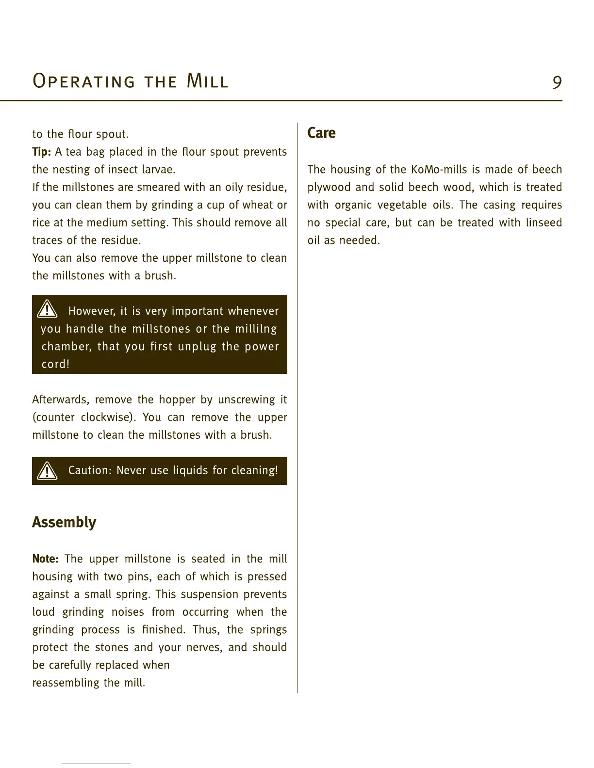 Komo Fidibus Medium - Advanced Mill Operations; Flour Spout Tips and Oily Residue Cleaning; Millstone and Chamber Cleaning Procedures; Caution on Liquid Cleaning and Assembly