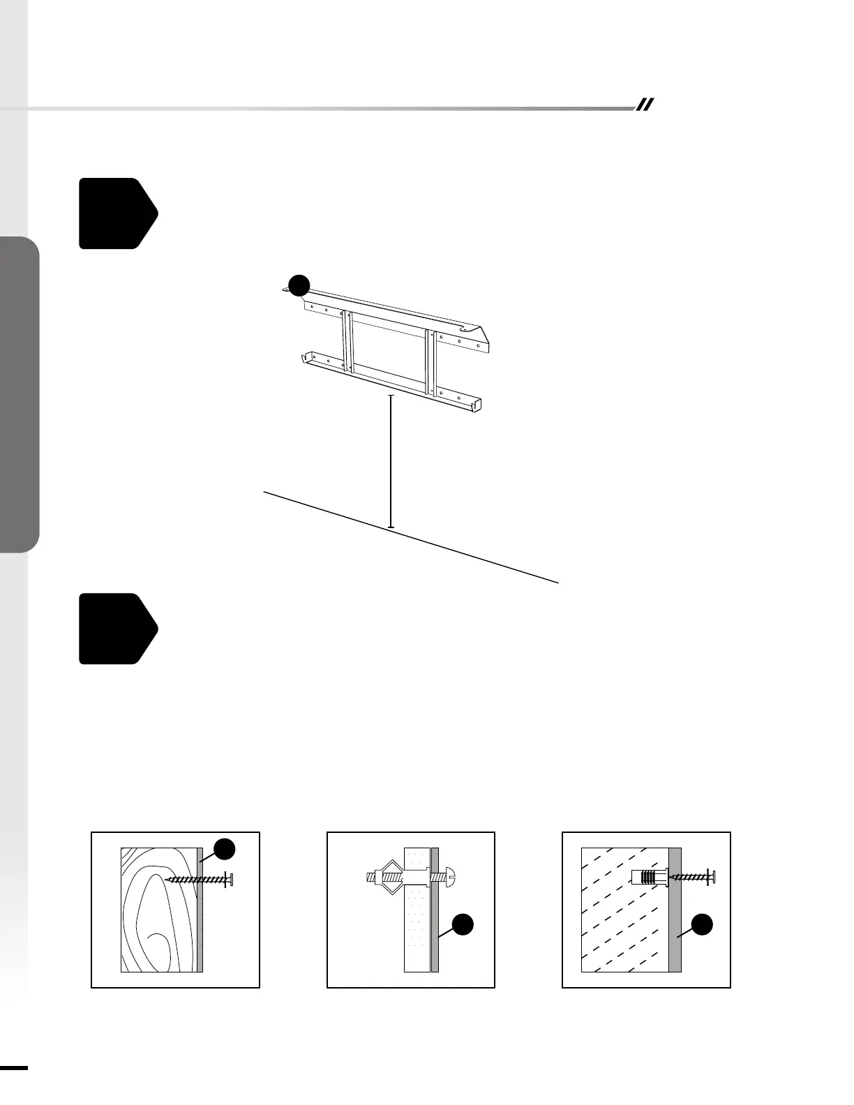 • Drill holes at marked locations and secure the mounting bracket (D) to the wall with toggle