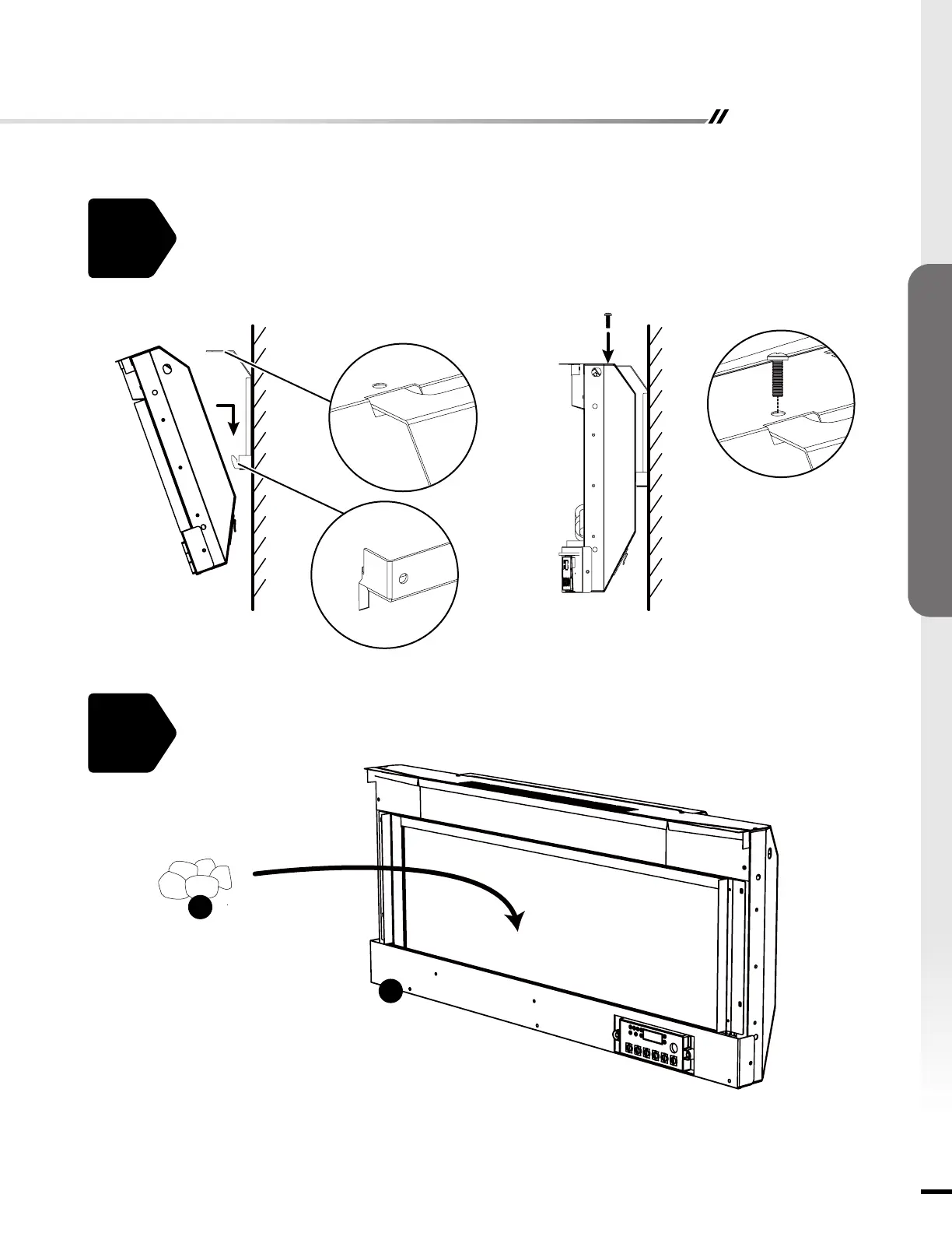 Hang the fireplace (C) on the hooks at bottom of mounting bracket (D) and push the