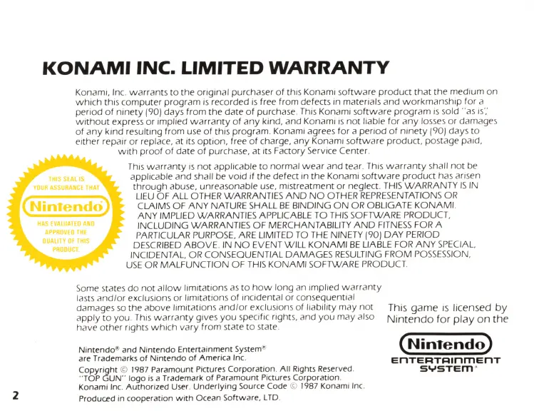 Konami TOP GUN - Konami Inc. Limited Warranty