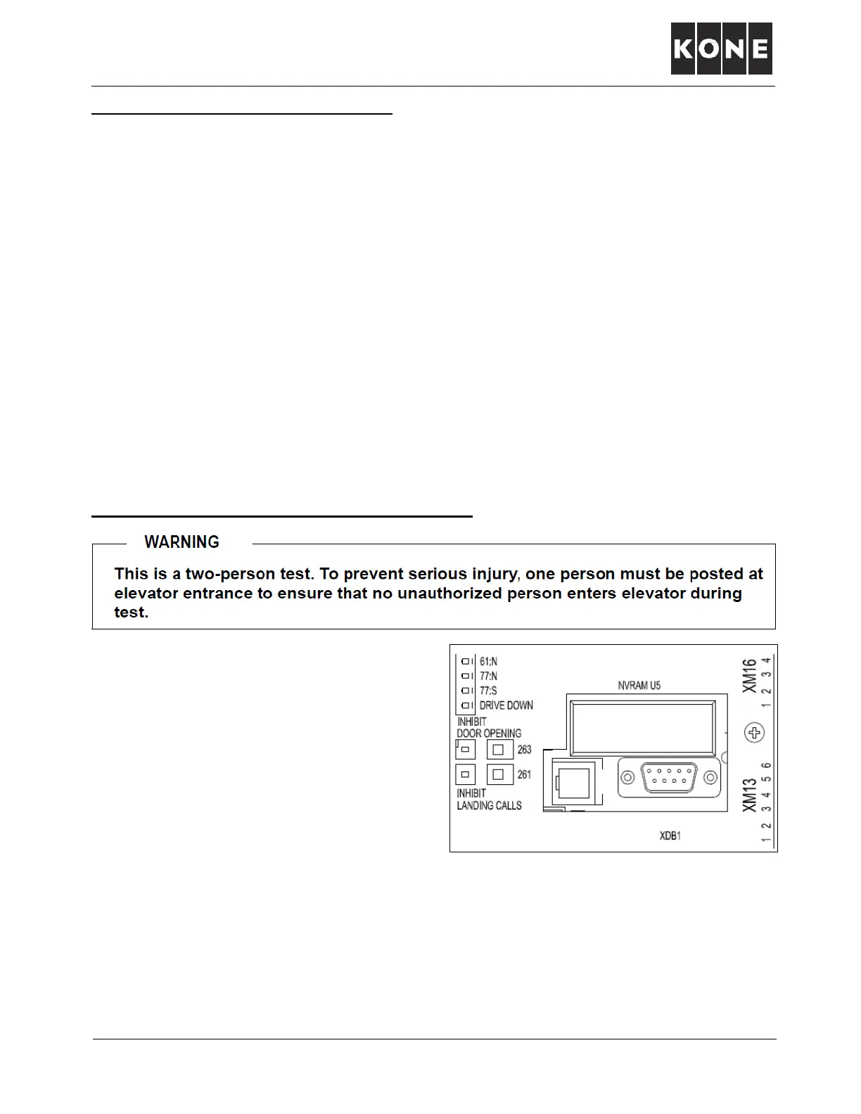WARNING! Prevent persons from attempting to enter elevator during following tests by
