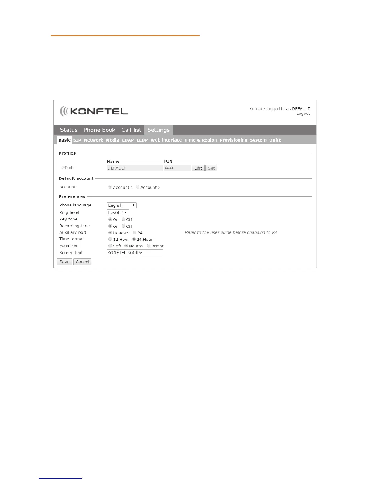 The Konftel 300IPx can save settings for two accounts, e.g. a company PBX and a public
