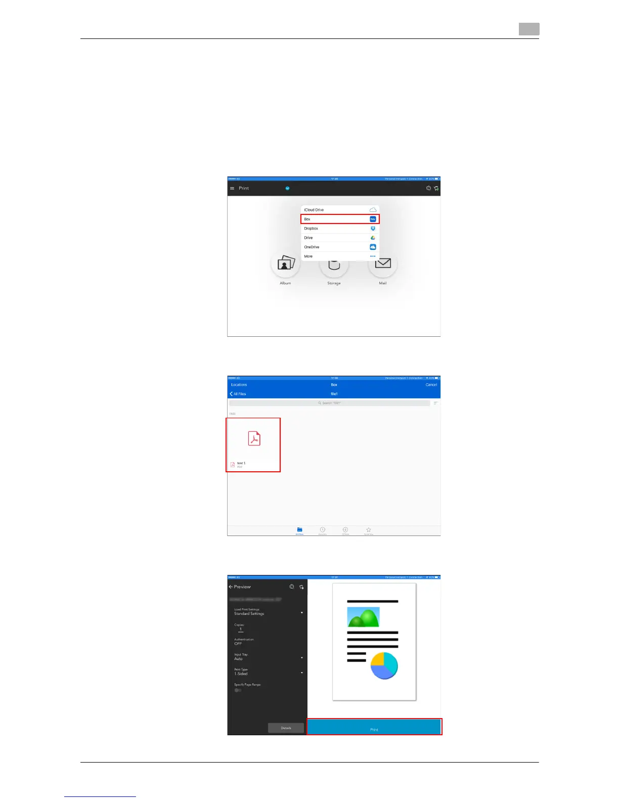 This section describes a procedure example to print data of the Box application. The displayed applications