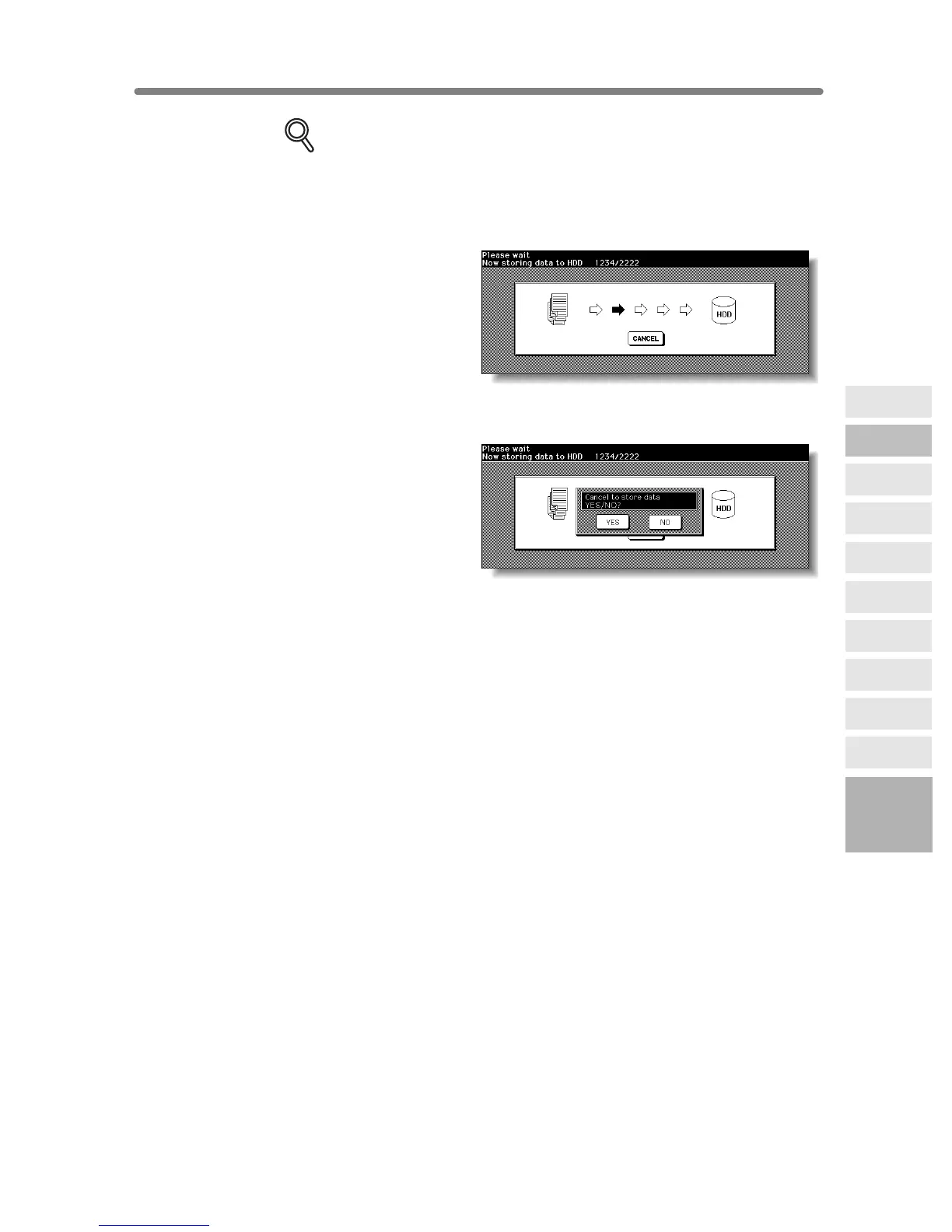 On this screen, touch CANCEL to suspend the storing job, then touch YES