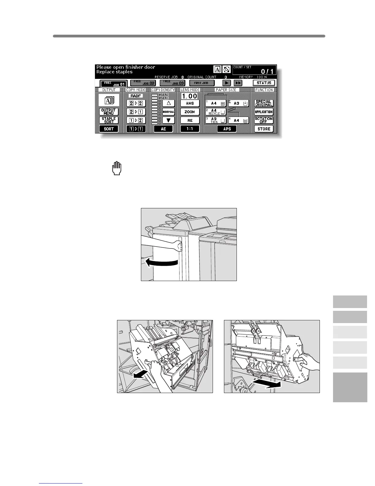 When the staple cartridge of the Finisher is empty, the Basic Screen displays the