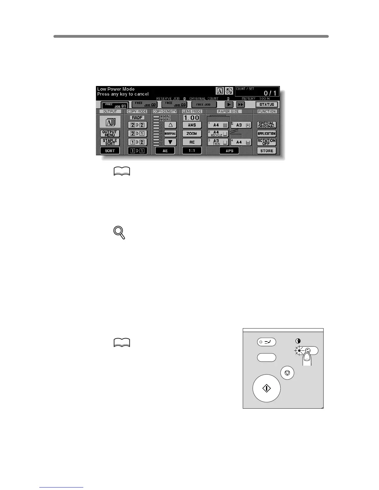 minutes) of copier inactivity. The LCD screen becomes dark with the message “Low