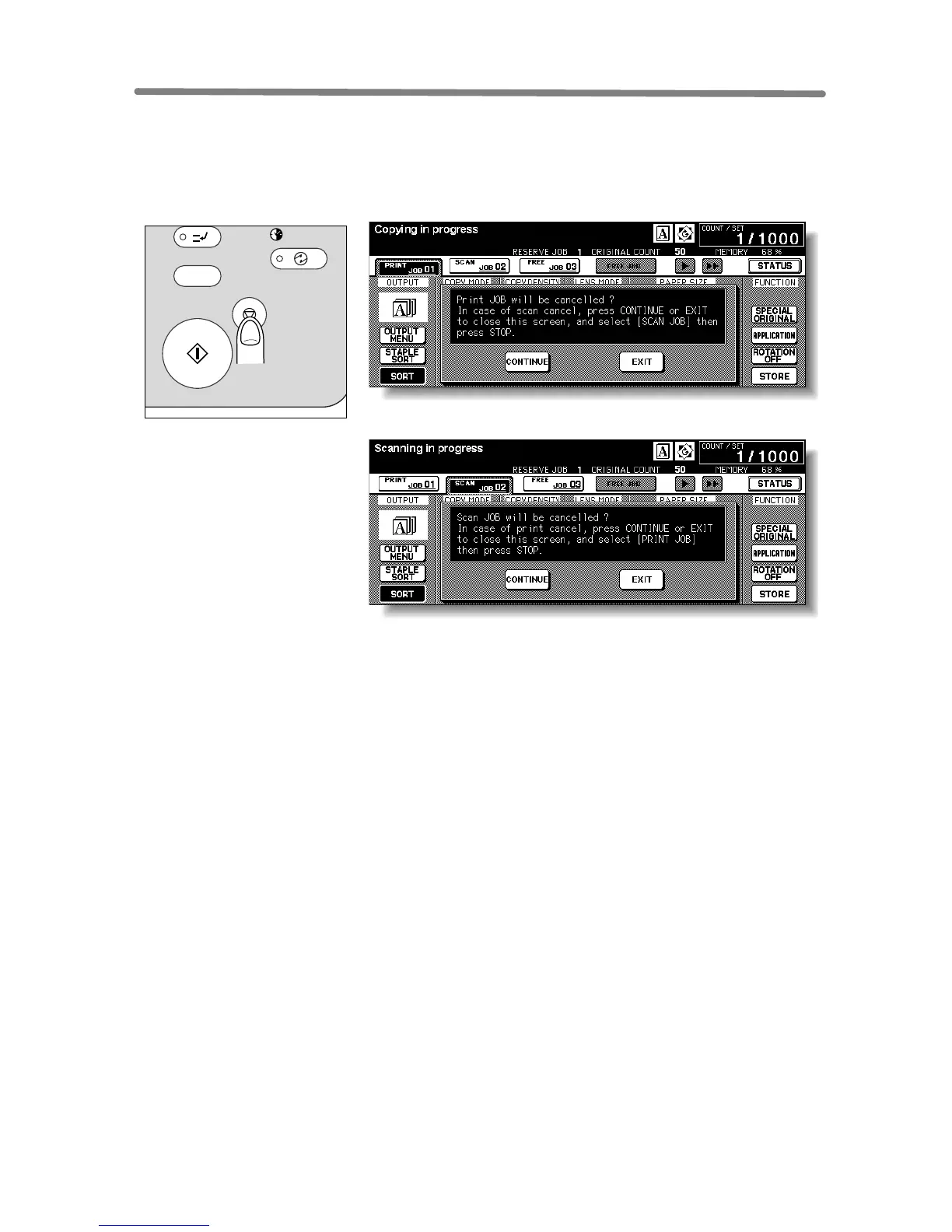 menu will display on the Basic Screen to ask you to continue or cancel the job.