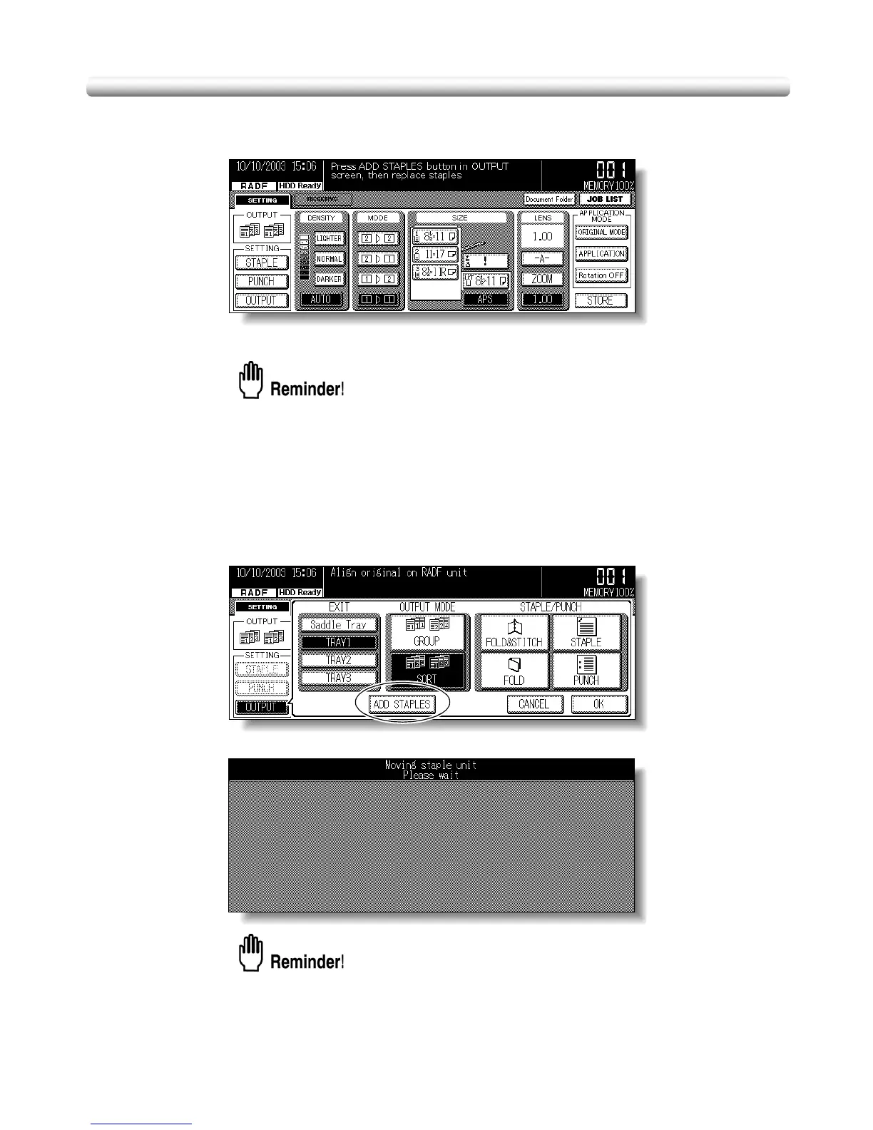 When the staple cartridge becomes empty in the FS-114 Finisher, the Basic Screen
