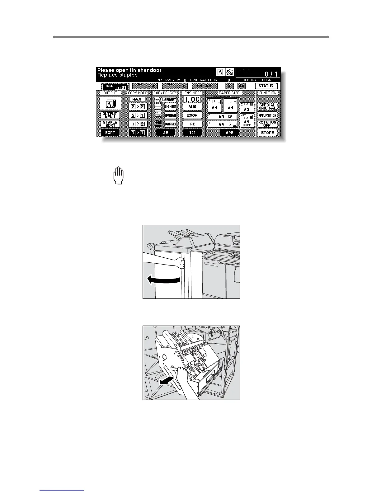 When the staple cartridge of the Finisher is empty, the Basic Screen dis-