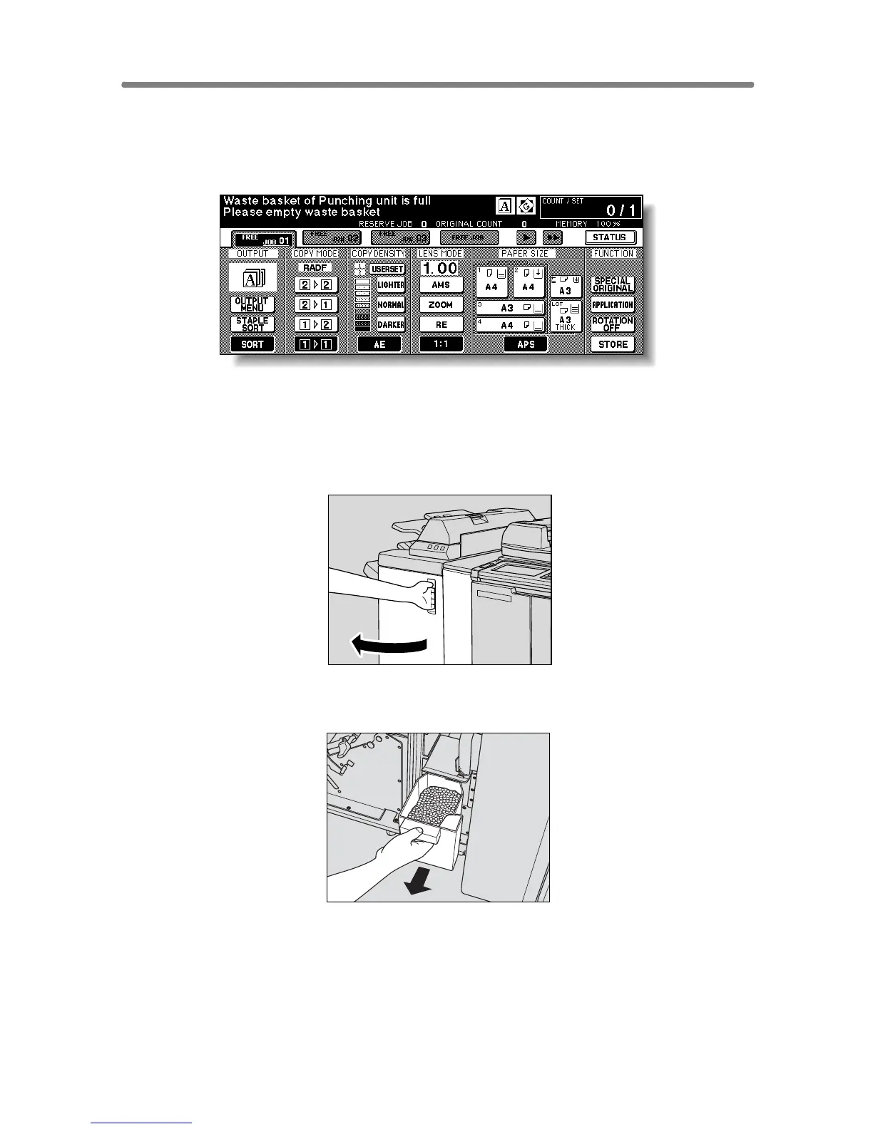 When the waste basket becomes full, “Waste basket of Punching unit is full /