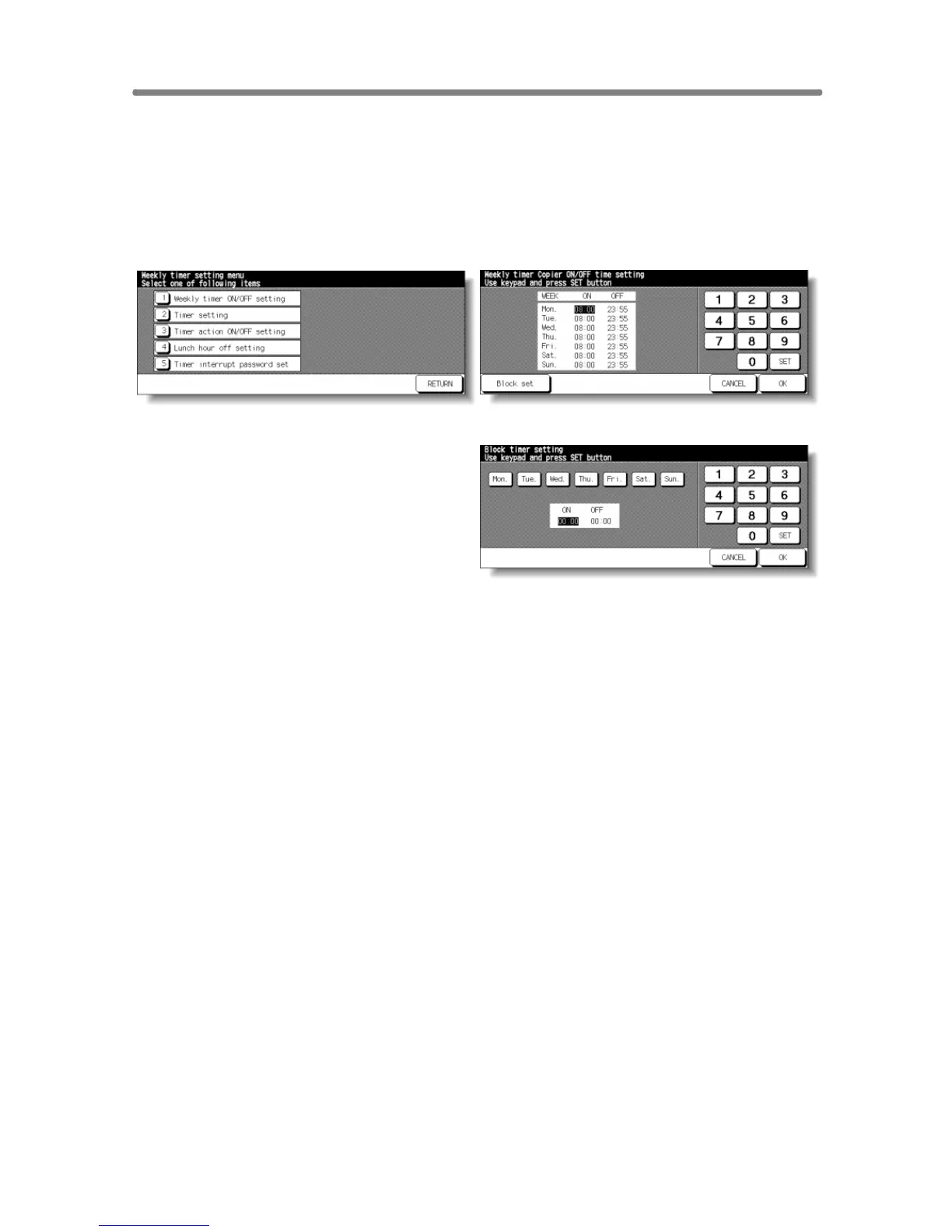 Weekly Timer Setting Menu Screen Weekly Timer On/Off Time Setting Screen