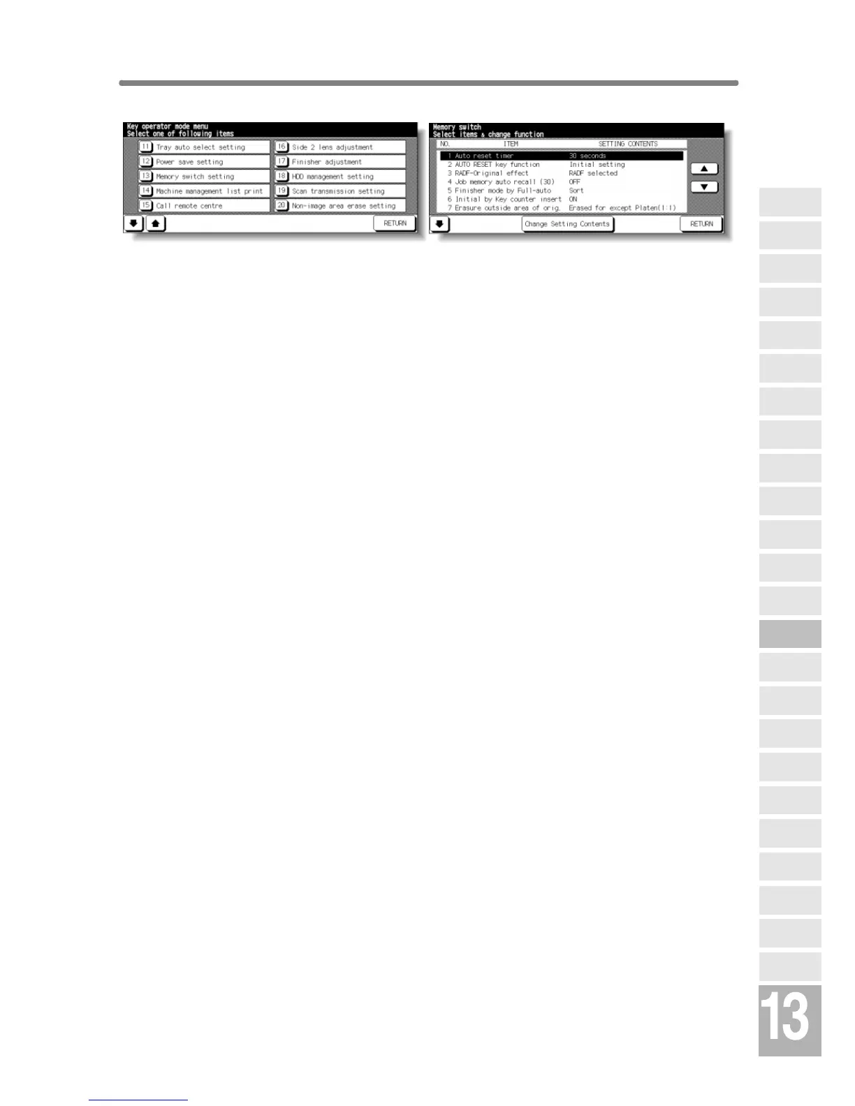 1 Touch [13] Memory switch setting on the Key Operator Mode Screen to